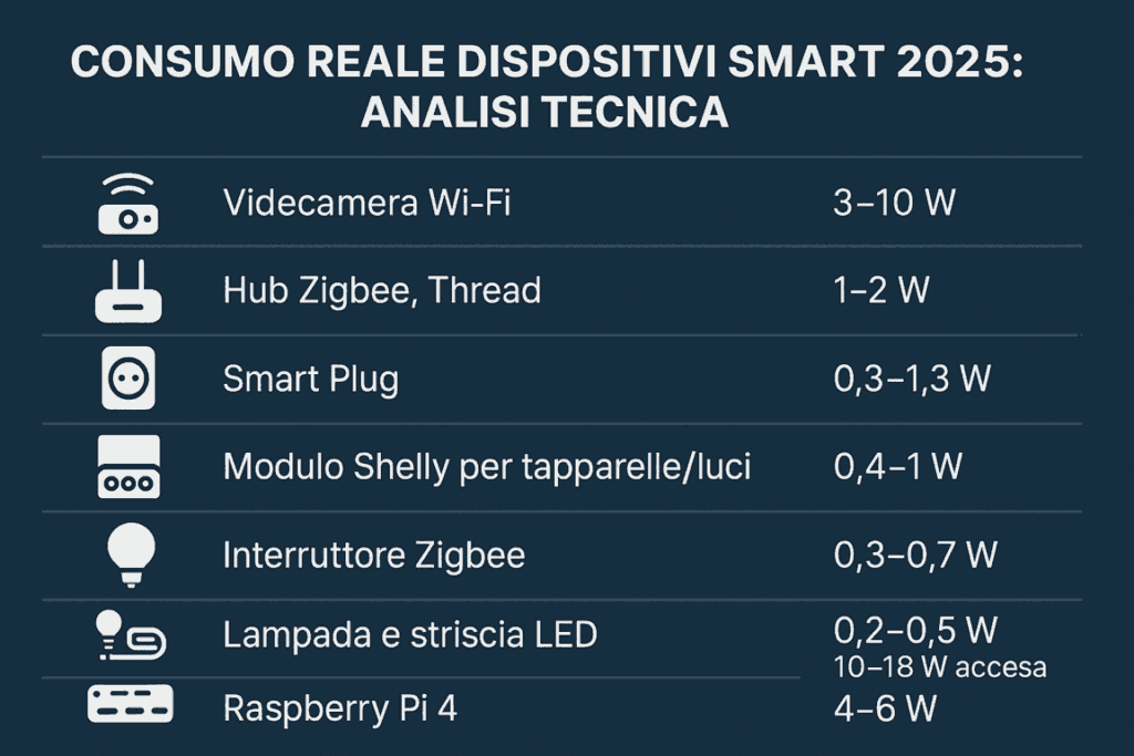 I dispositivi smart collegati alla rete elettrica rappresentano il vero consumo continuo di una casa domotica. Sensori e dispositivi a batteria hanno un impatto praticamente nullo, mentre videocamere, relè, hub, router, smart plug e sistemi come Home Assistant incidono in modo più concreto.